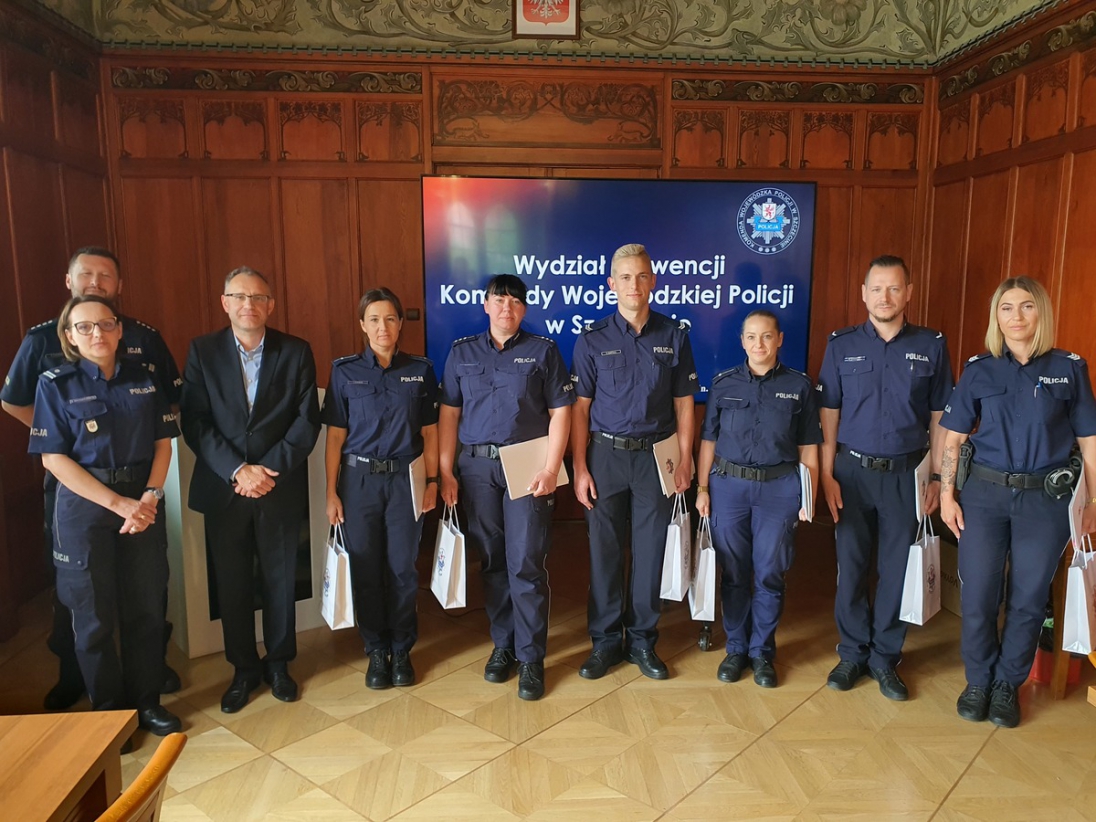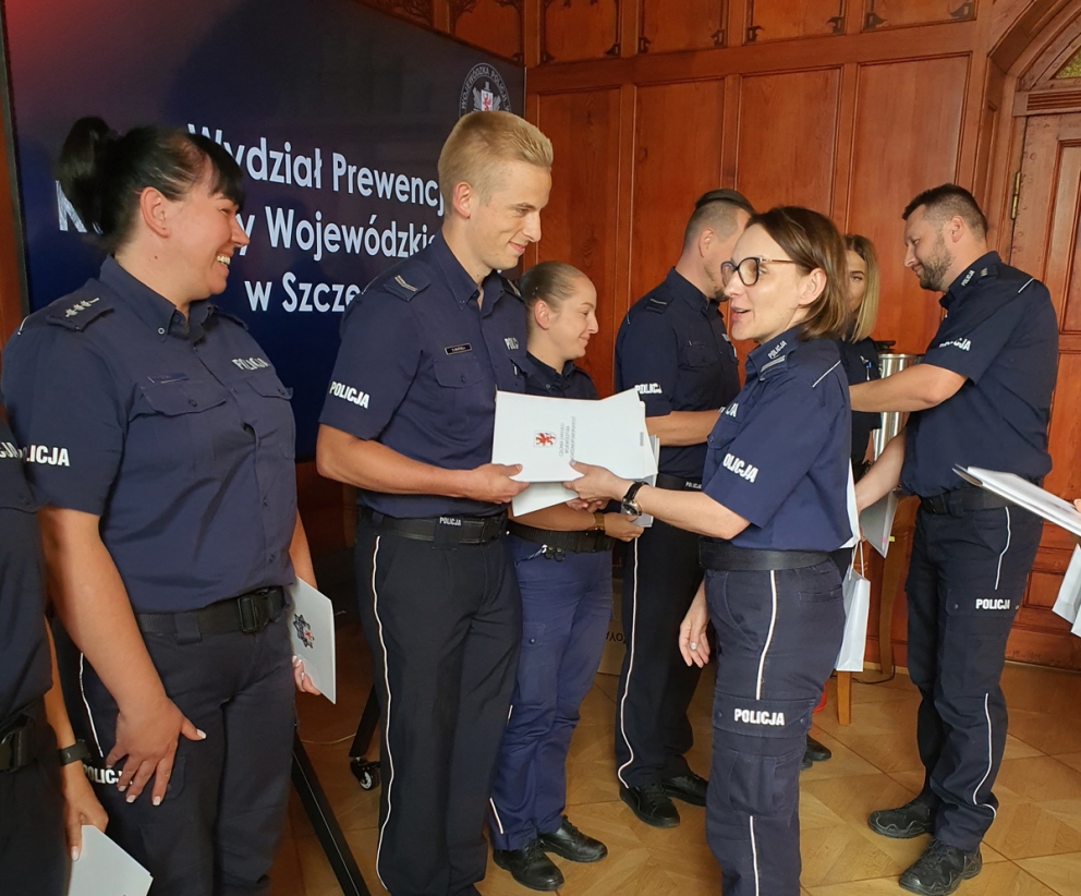 Podczas organizowanego w dniu 14 czerwca w siedzibie Komendy Wojewódzkiej Policji w Szczecinie szkolenia dla policjantów zajmujących się profilaktyką społeczną na terenie wszystkich jednostek garnizonu zachodniopomorskiego, podsumowano bieżącą realizację programów profilaktycznych realizowanych w ramach umowy WBiOIN/5/2024 z dnia 16 lutego 2024r., tj. "Bystry Przedszkolak" i "Roztropny Senior". W ramach podkreślenia szczególnego zaangażowania w realizację wyżej wymienionych przedsięwzięć wręczono podziękowania wyróżniającym się funkcjonarouszom Zachodniopomorskiej Policji takich jak: