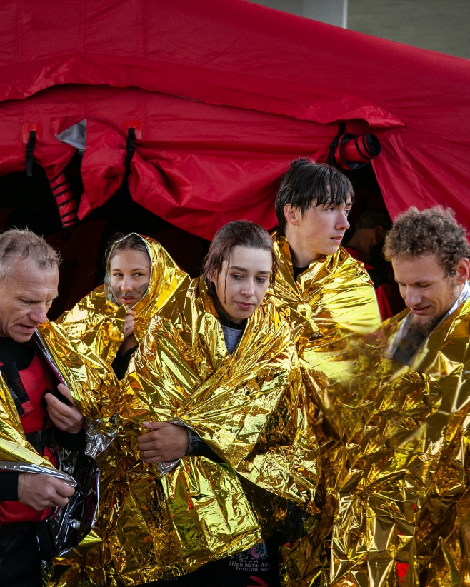 - wejście ratowników na statek i ewakuacja poszkodowanych na łodzie,
