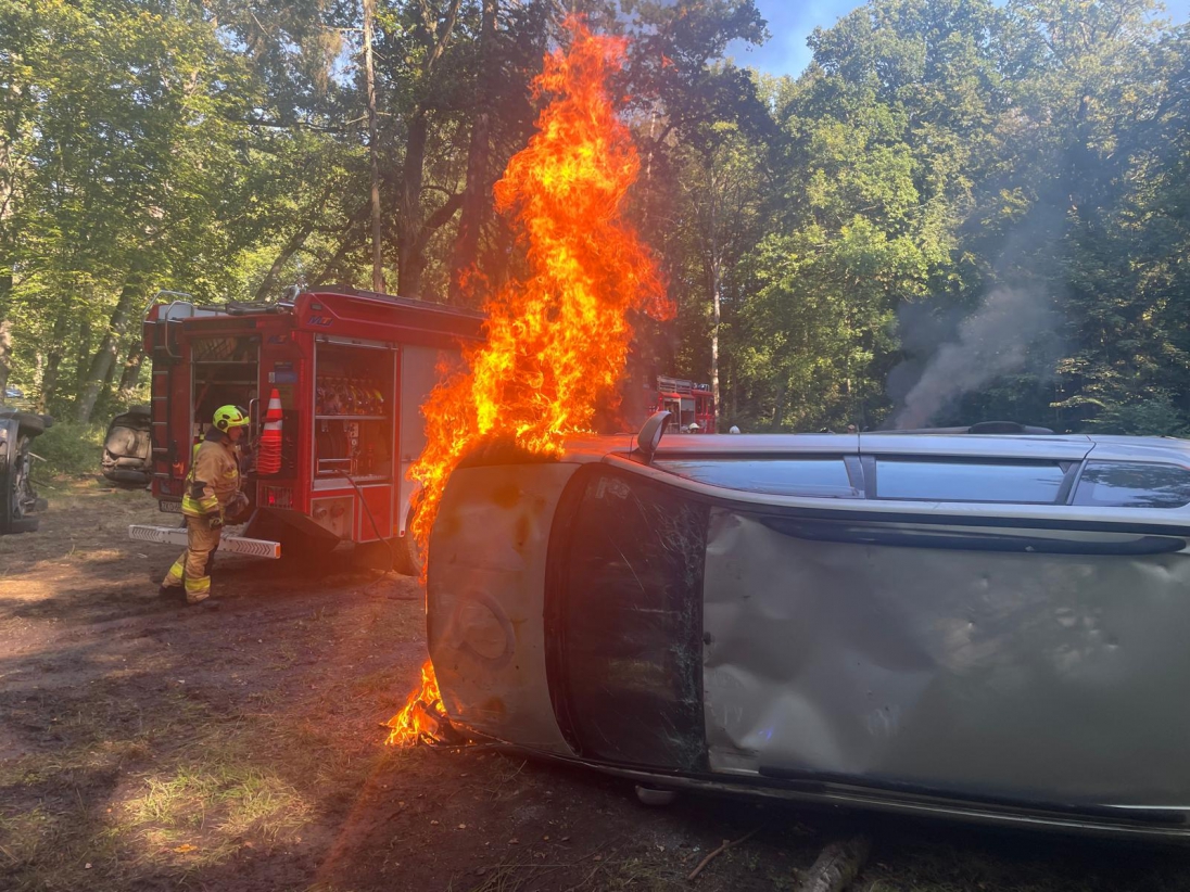 Przewrócony, płonący smaochód, w tle po lewej widoczny wóz gaśniczy straży pożarnej