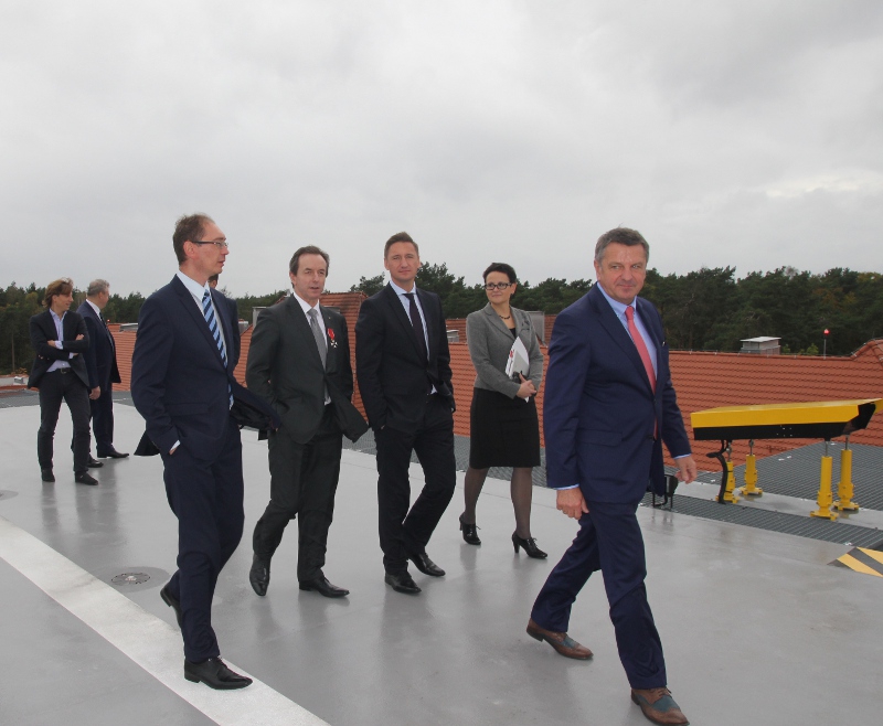 Lądowisko dla helikopterów na dachu obiektu lustrują pos. Marek Hok (na pierwszym planie) oraz marszałek Olgierd Geblewicz (trzeci z prawej). Towarzyszą im radny dr Łukasz Tyszler, dr Tomasz Grodzki i rzecznik prasowy Gabriela Wiatr.,