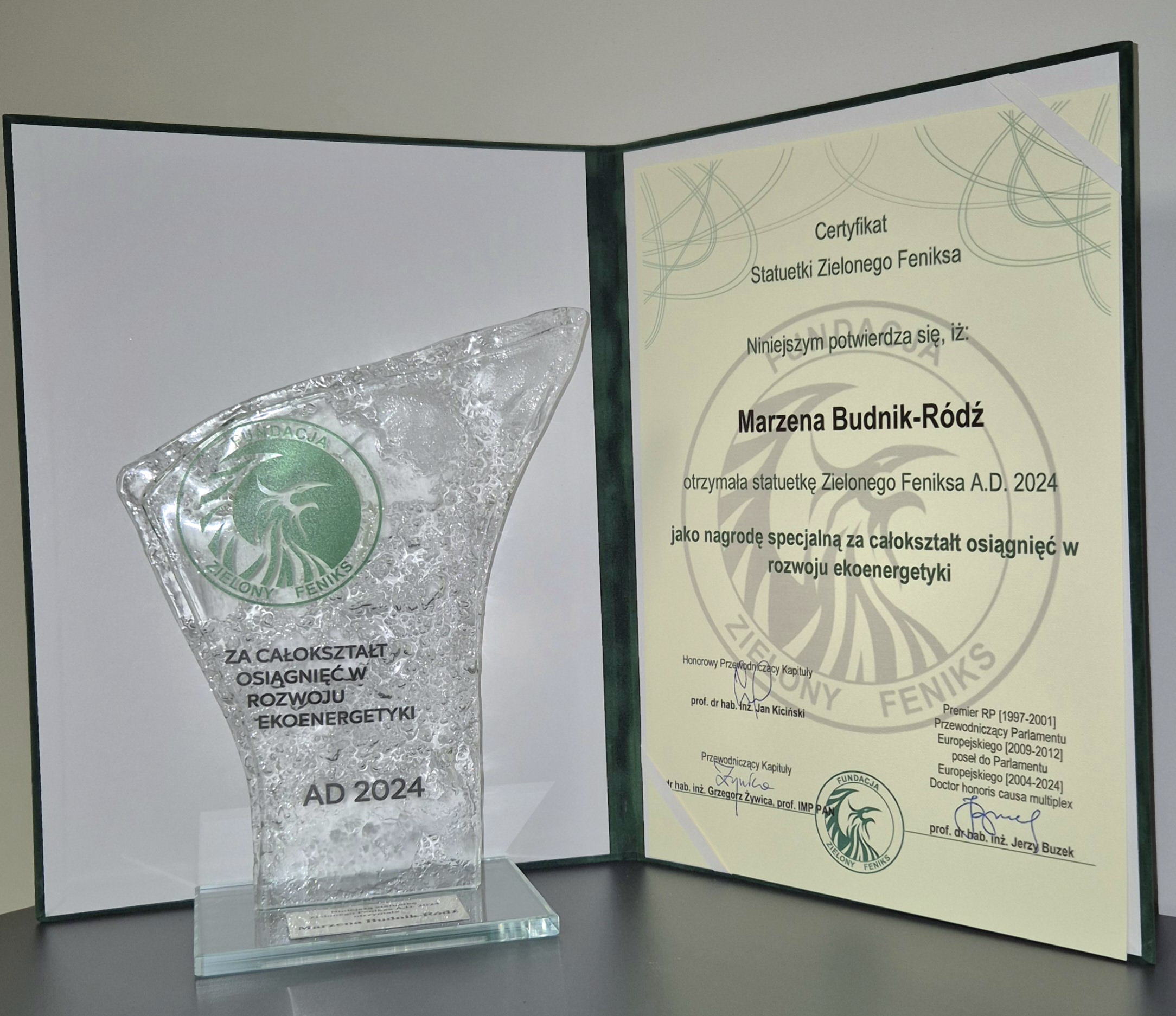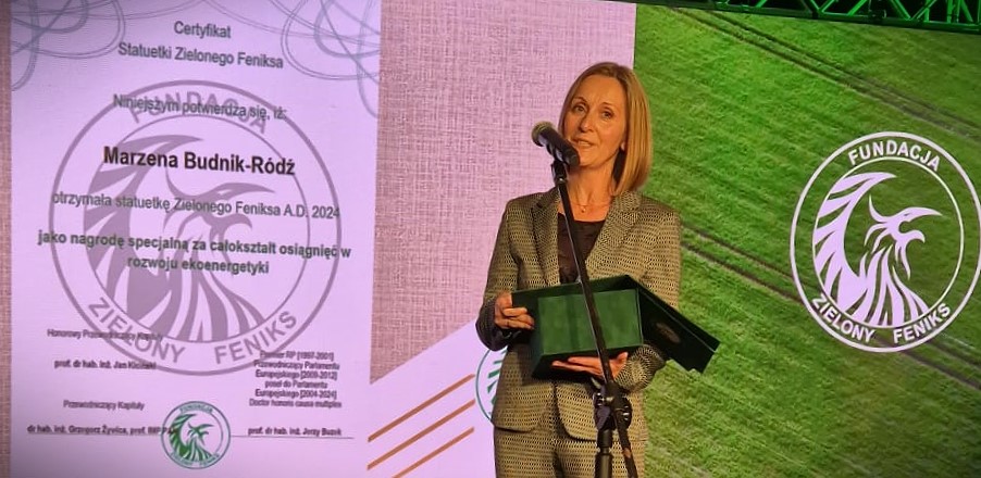 W roku bieżącym Kapituła Nagrody „Zielonego Feniksa” przyznała nagrodę specjalną „za wkład w rozwój ekoenergetyki” Pani Marzenie Budnik-Ródź Kierownik Biura ds. Bezpieczeństwa i Energetyki w Wydziale Bezpieczeństwa i Ochrony Informacji Niejawnych.